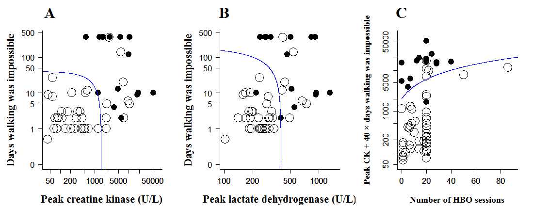 Model 3に基づくFig 2Cからは、中程度の患者(peak CK + 40 × WALK = 2000–12000)では20回程度のHBOでDNSが防げるように思われる。
