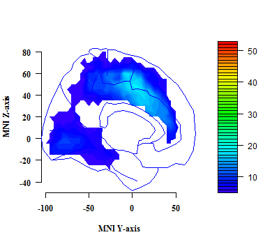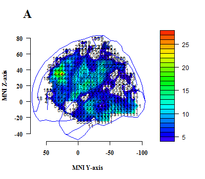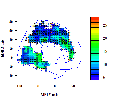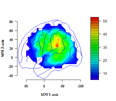 Figure 2のように、この研究ではもっとも症例数が多い部位は脳表から1cm深部であったため、その深さでもっとも統計的パワーが大きいと考え、検討部位はその部位、すなわちMNI座標系でx座標は脳表面から深部1cmとした。