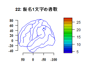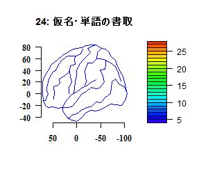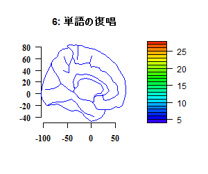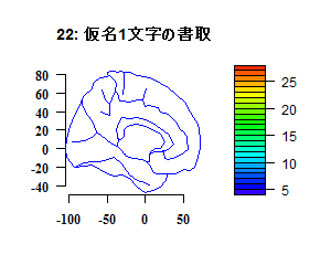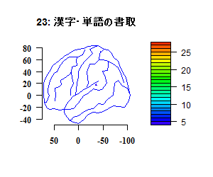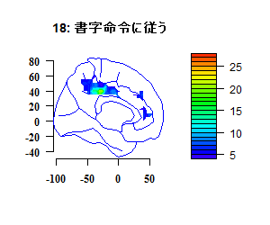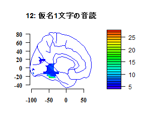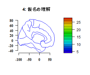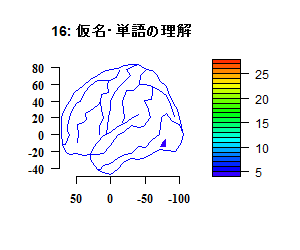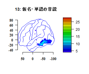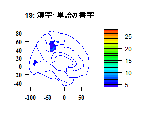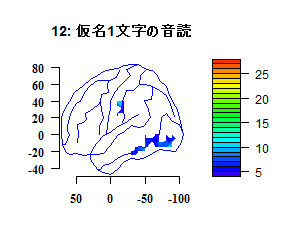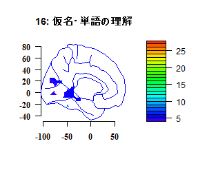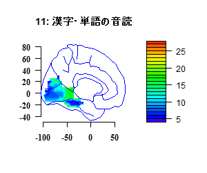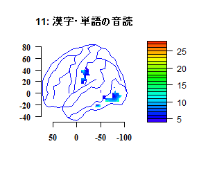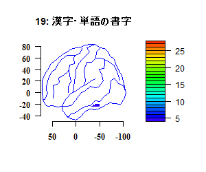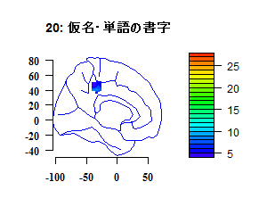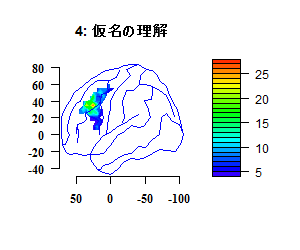 個別の皮質部位と課題の関係について論じると、第1に、中前頭回病巣とsubtest 4 "音とかな文字のマッチング" の関係が示された。
