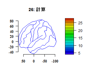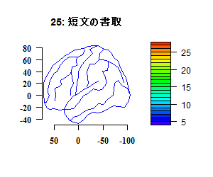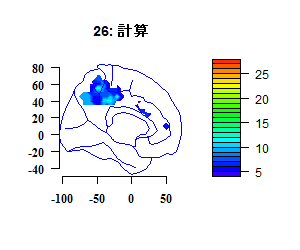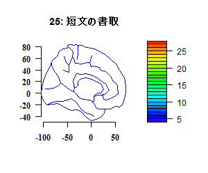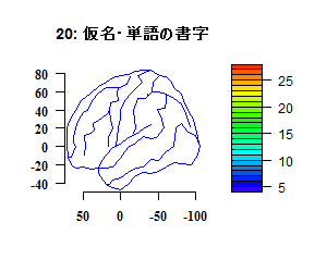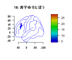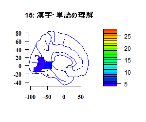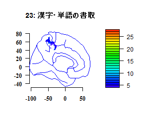 我々はロジスティック判別分析を行い、26課題からなる日本語の標準失語症バッテリーを用いて150例の患者を対象にした成績データから、左大脳皮質の各部位ごとに、病巣群と非病巣群をもっともよく判別できる課題を選んだ。
