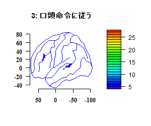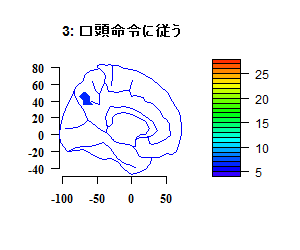 しかし対象患者の素正答率を使ってt検定のVLSMを施行しても、単語復唱と関係が強い部分は同様に中心後回周囲に限局し、Figure3の図と似た結果になった。(そのt値分布図は省略した。)