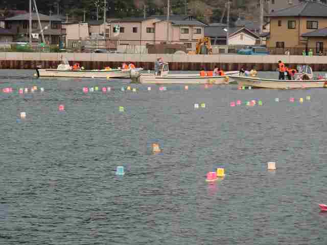 市長挨拶、実行委員長挨拶があって、上流から船が数槽、色とりどりの灯籠を川に浮かべていく。