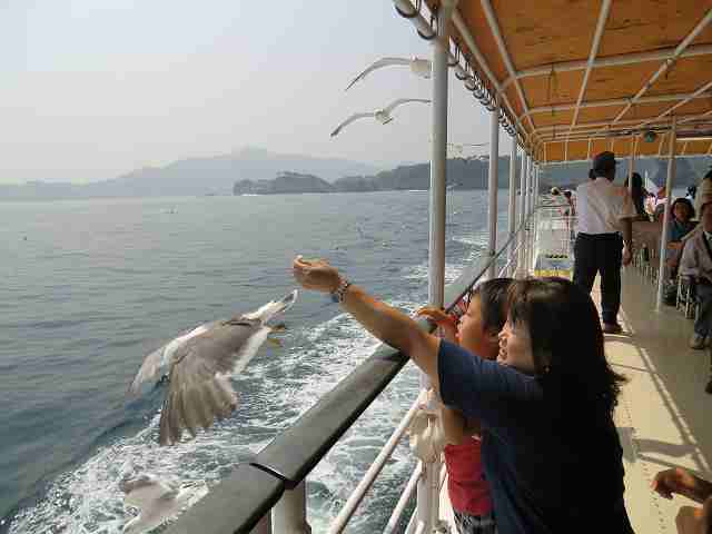 この船はむらがるウミネコに、パンを手で食べさせられるのが売り物。